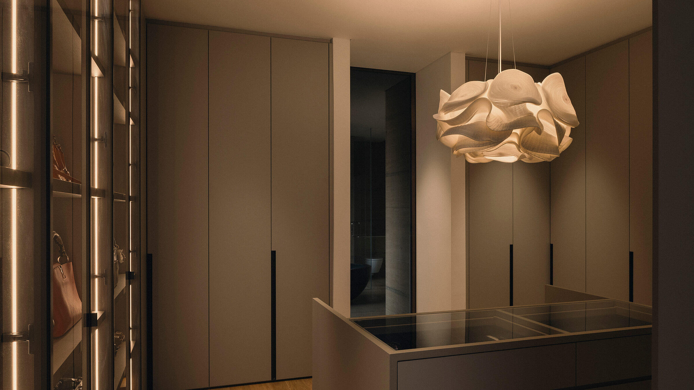 进入室内,房屋以三重开阔空间而引人注目。光线洒满入口处,将人们的视线引向位于住宅中心的干厨房。该项目是与厨房专家 Cubo Collective 合作完成的,是一项建筑宣言。绿色大理石占据了中心位置,其流动的纹路让人联想到竹子的茎秆和水的流动,简约的橱柜则与房屋结构浑然融为一体。它们共同构成了兼顾功能与精致、日常使用与静谧戏剧风格的组合。