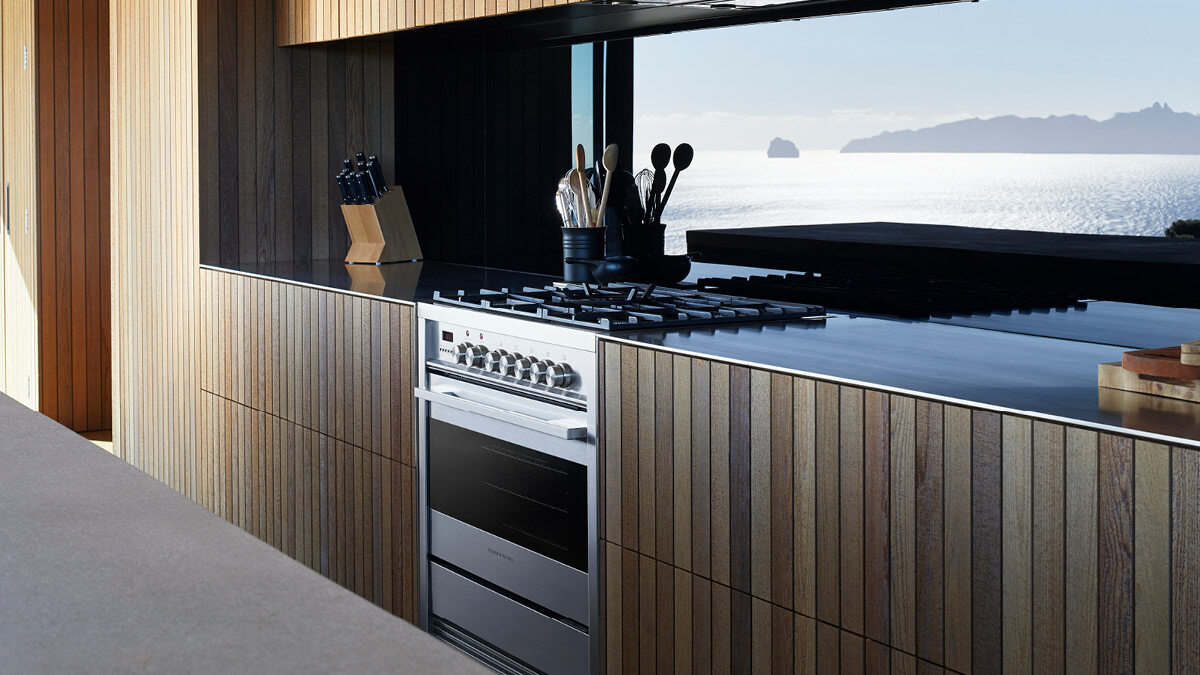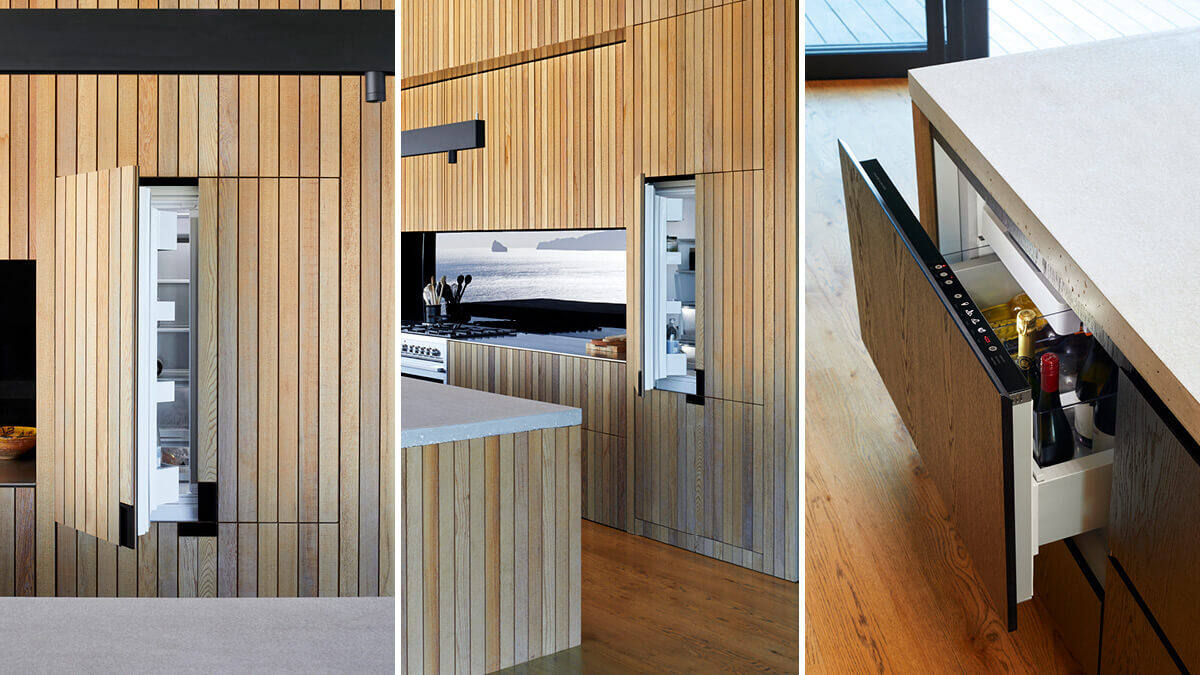 在厨房中,Fisher & Paykel 法式对开门冷藏/冷冻冰箱和 CoolDrawer™ 冰箱的整合在保持内外一致的木材主题方面发挥了关键作用。另一方面,现代型燃气炉灶打破了原木方案,使其成为一个对比鲜明的部分,在中央起居区令人惊叹的细节和完美的设计中吸引着人们的眼球。