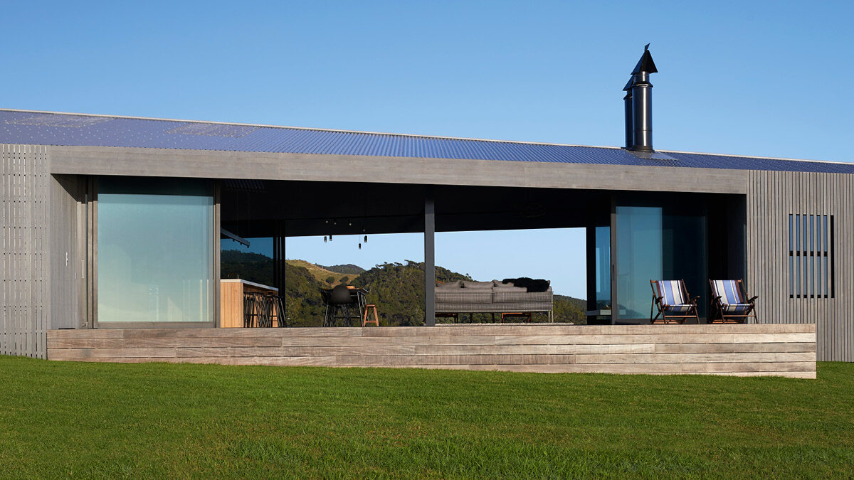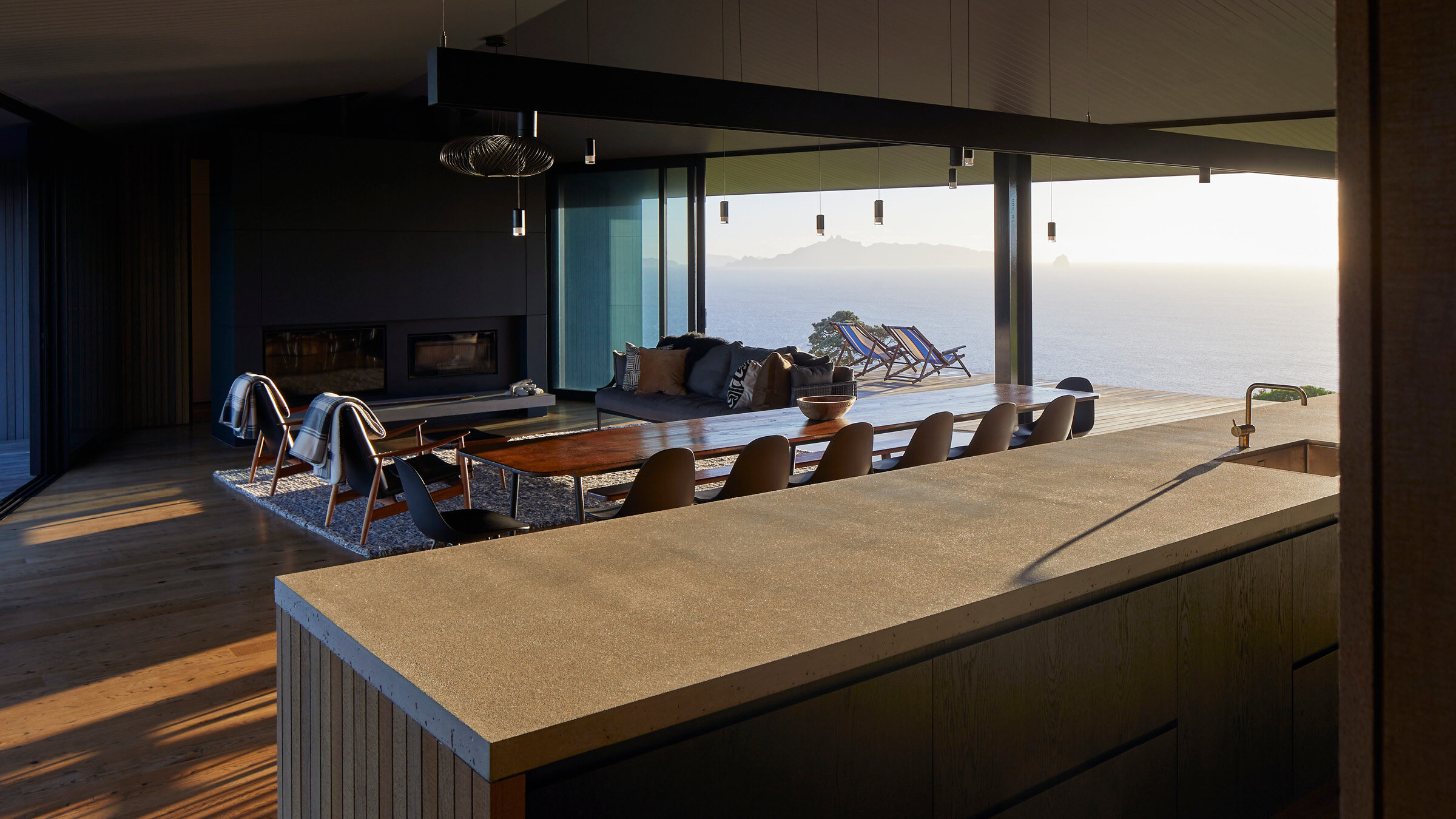 “飞镖”紧贴山脊轮廓,建筑两侧设有可伸缩的滑动门,打开后形成一条通风廊道,打破了建筑的形式,海洋和山丘的美景尽收眼底。建筑师在室内和室外使用了相同的木板条,进一步模糊了室内和宽阔的室外露台之间的界限。中央区域设计为社交空间,包括厨房和开放式起居区,在两翼之间形成流动感,并可将 Breamtail 地区的壮丽景色尽收眼底。