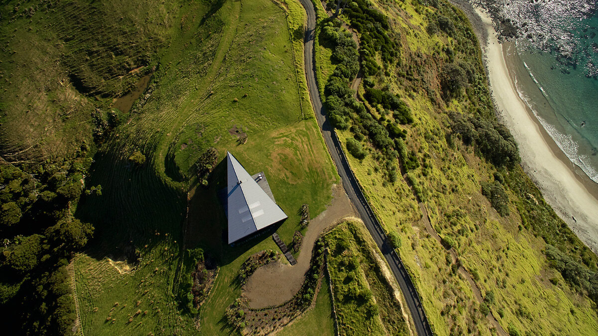 这座度假屋由 Studio John Irving Architects 设计而成,高高耸立在新西兰的芒阿法埃海岸之上,形似一支飞镖,优雅地向尖端延伸,在所处景观中形成了一种强烈的雕塑感。