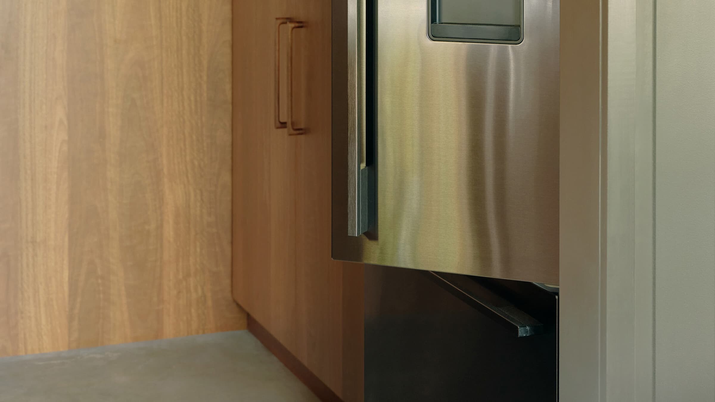楼下空间未设内墙,而是巧妙利用细木工板、开孔设计、色彩点缀及壁炉布局,灵活界定公共与私密空间。厨房与餐厅位于房屋后部,直通花园。为款待宾客,客户精选 Fisher & Paykel 电器,与整体简约厨房设计及色调相得益彰。